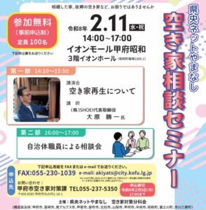 2/11(水祝)県央ネットやまなし「空き家相談セミナー」で講演を行います。